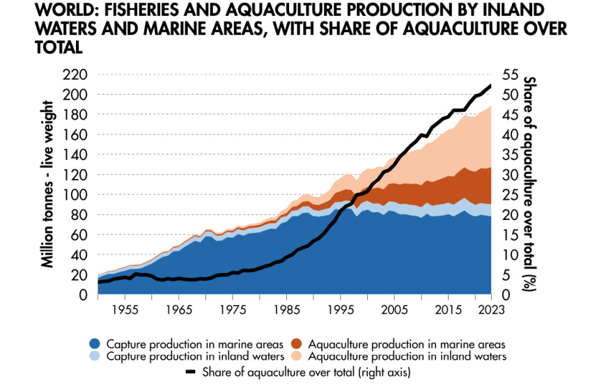 Se olvidan de que la acuicultura ya ha superado a la pesca en la oferta de pescado a nivel mundial, pues en 2023, la acuicultura representó aproximadamente el 52,2% de la producción total de animales acuáticos, mientras que la pesca de captura supuso el 47,8% restante, consolidando la tendencia creciente del cultivo, según la FAO.